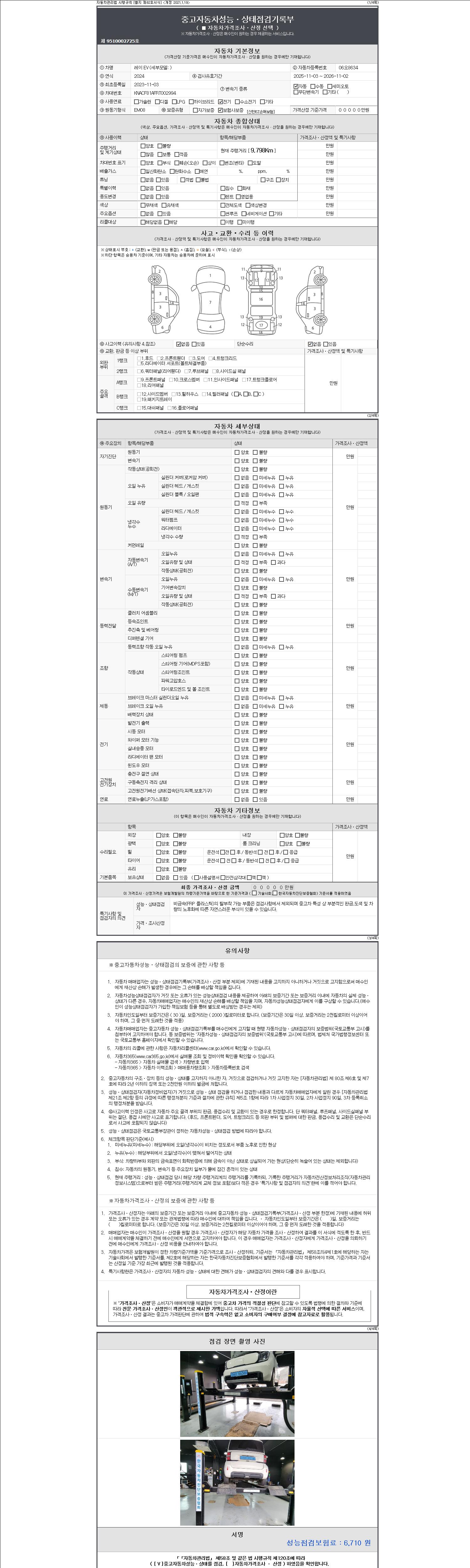 자동차관리법 시행규칙 제120조의 규정에 따라 별지 제 82호서식 《중고자동차 성능, 상태점검 기록부》를 발행한 성능, 상태점검자 및 매매자는 아래의 보증기간 또는 보증거리 이내의 중고자동차, 성능점검 기록부에 기재된 내용과 자동차의 실제 성능, 상태가 다른 경우 계약 또는 관계법령에 따라 매수인에 대하여 책임을 집니다.