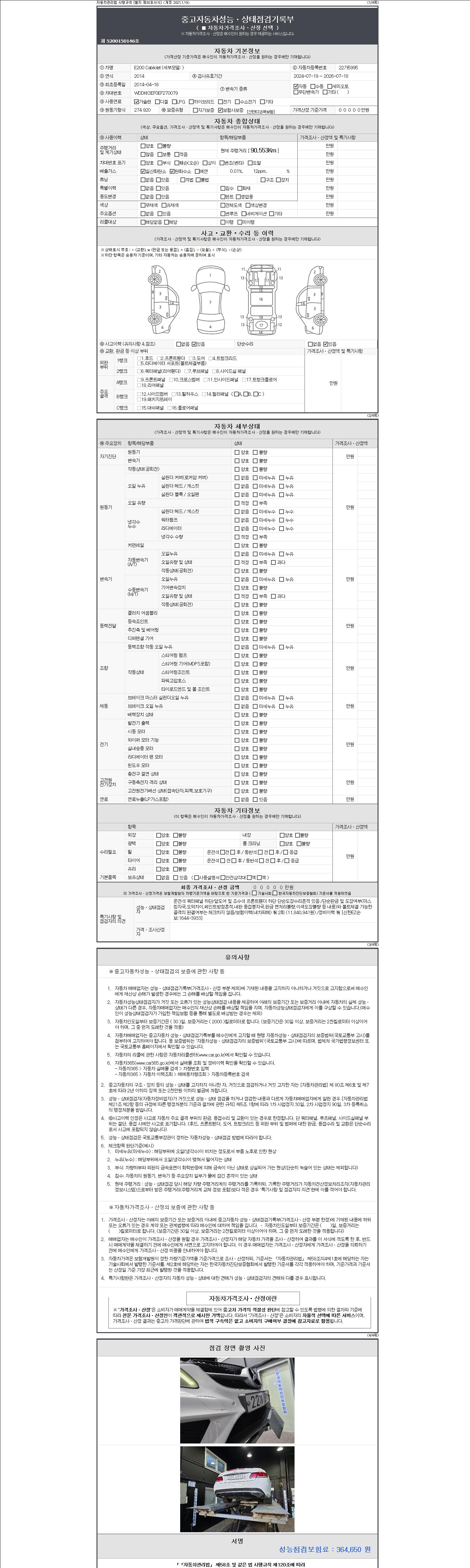 자동차관리법 시행규칙 제120조의 규정에 따라 별지 제 82호서식 《중고자동차 성능, 상태점검 기록부》를 발행한 성능, 상태점검자 및 매매자는 아래의 보증기간 또는 보증거리 이내의 중고자동차, 성능점검 기록부에 기재된 내용과 자동차의 실제 성능, 상태가 다른 경우 계약 또는 관계법령에 따라 매수인에 대하여 책임을 집니다.