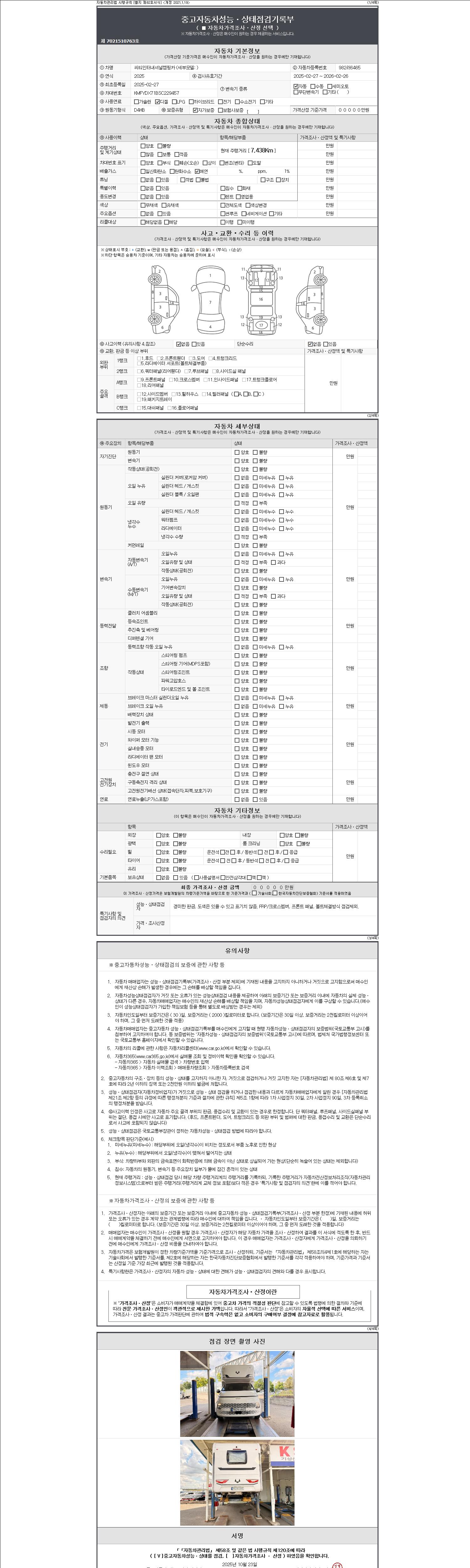 자동차관리법 시행규칙 제120조의 규정에 따라 별지 제 82호서식 《중고자동차 성능, 상태점검 기록부》를 발행한 성능, 상태점검자 및 매매자는 아래의 보증기간 또는 보증거리 이내의 중고자동차, 성능점검 기록부에 기재된 내용과 자동차의 실제 성능, 상태가 다른 경우 계약 또는 관계법령에 따라 매수인에 대하여 책임을 집니다.