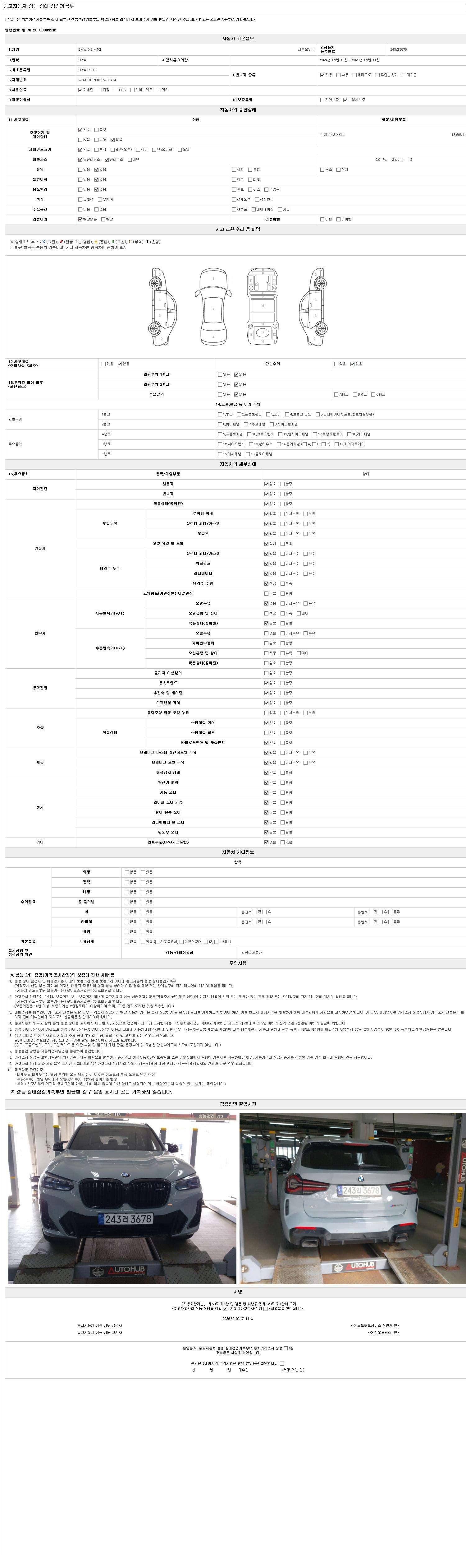 | 주행거리 | 13,608 km | 차량번호 | 243러3678 | 사고유무 | 성능기록부 참조 | 제시번호 | 제 2147483647 호 |