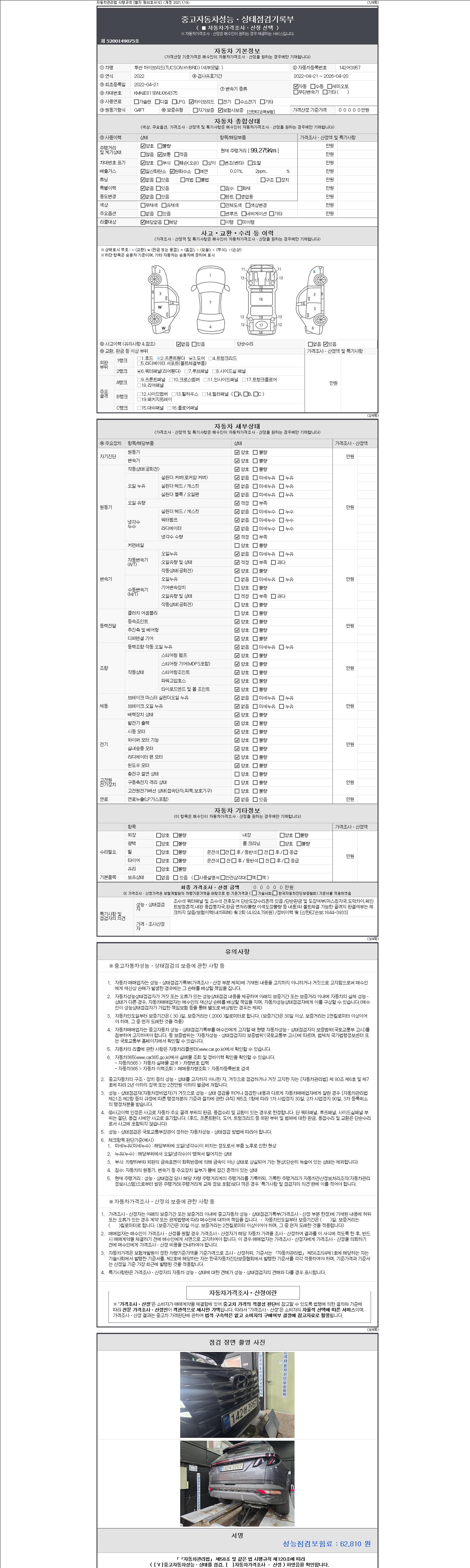 자동차관리법 시행규칙 제120조의 규정에 따라 별지 제 82호서식 《중고자동차 성능, 상태점검 기록부》를 발행한 성능, 상태점검자 및 매매자는 아래의 보증기간 또는 보증거리 이내의 중고자동차, 성능점검 기록부에 기재된 내용과 자동차의 실제 성능, 상태가 다른 경우 계약 또는 관계법령에 따라 매수인에 대하여 책임을 집니다.