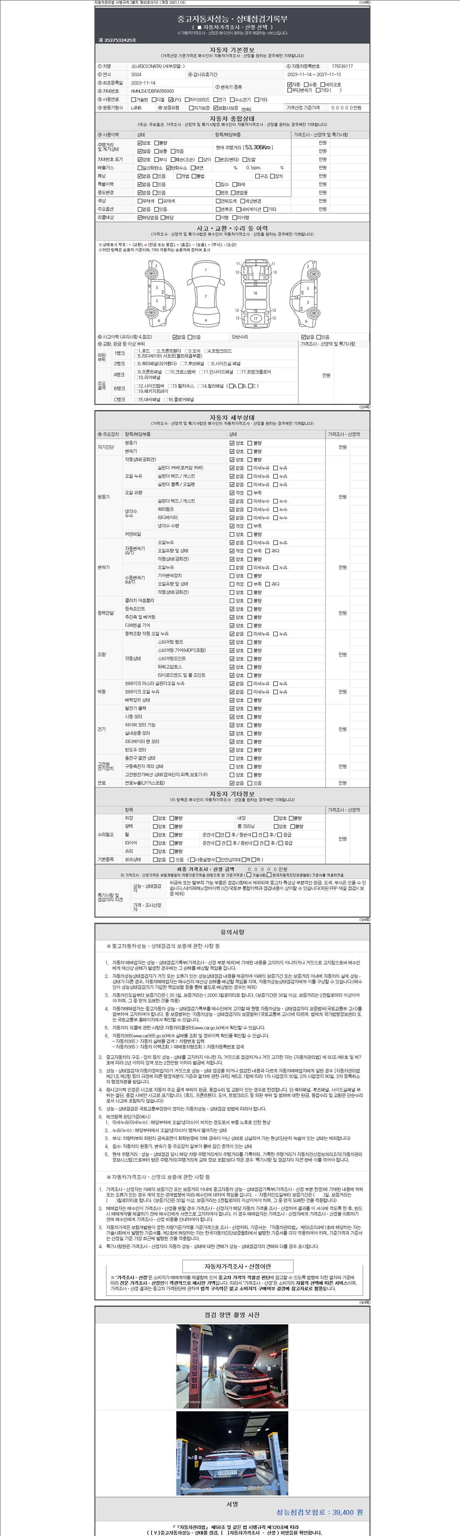 자동차관리법 시행규칙 제120조의 규정에 따라 별지 제 82호서식 《중고자동차 성능, 상태점검 기록부》를 발행한 성능, 상태점검자 및 매매자는 아래의 보증기간 또는 보증거리 이내의 중고자동차, 성능점검 기록부에 기재된 내용과 자동차의 실제 성능, 상태가 다른 경우 계약 또는 관계법령에 따라 매수인에 대하여 책임을 집니다.