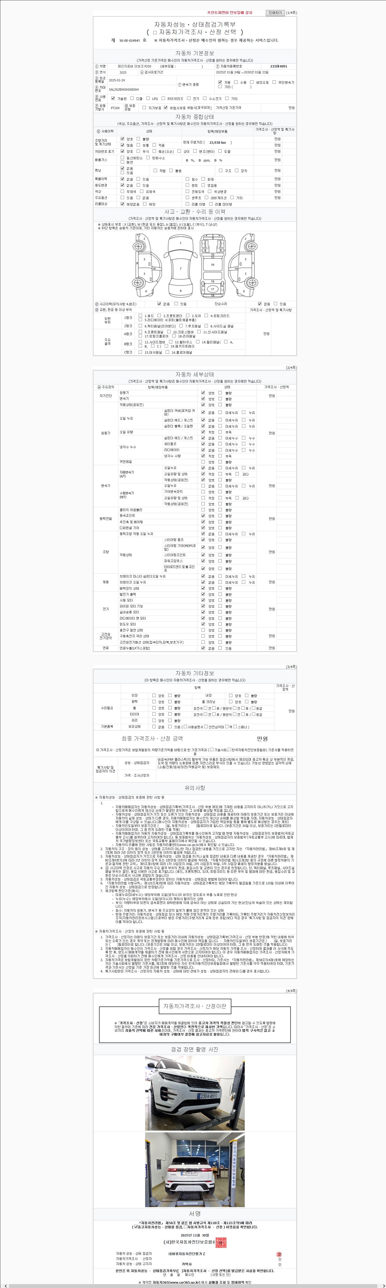 | 주행거리 | 23,938 km | 차량번호 | 235어4091 | 사고유무 | 성능기록부 참조 | 제시번호 | 제 2147483647 호 |