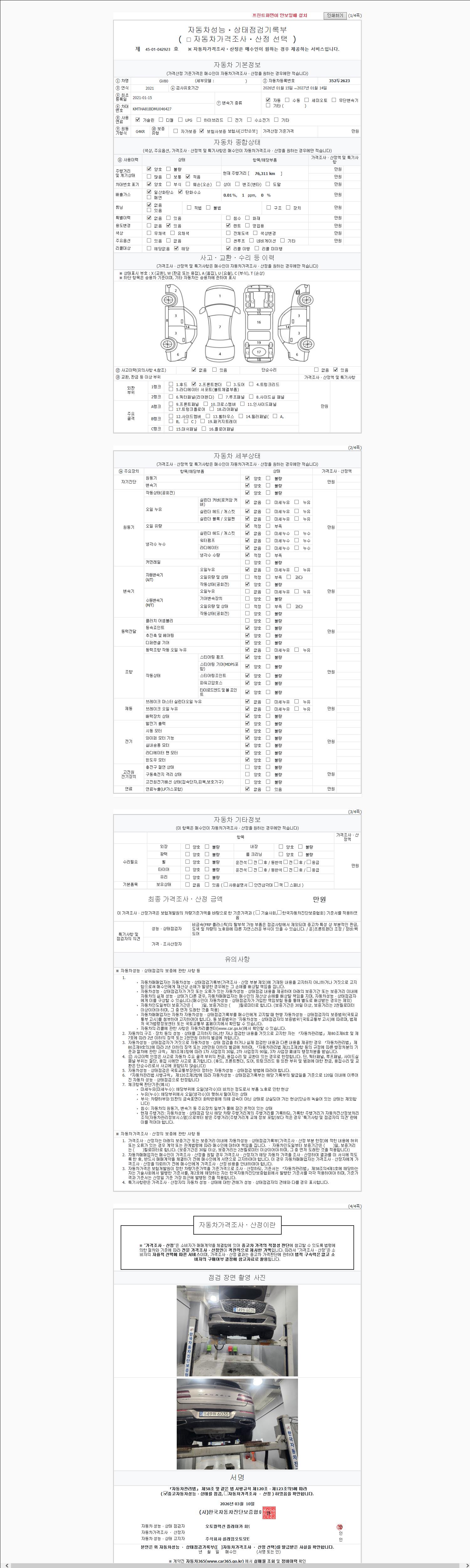 | 주행거리 | 76,311 km | 차량번호 | 352두2623 | 사고유무 | 성능기록부 참조 | 제시번호 | 제 2147483647 호 |