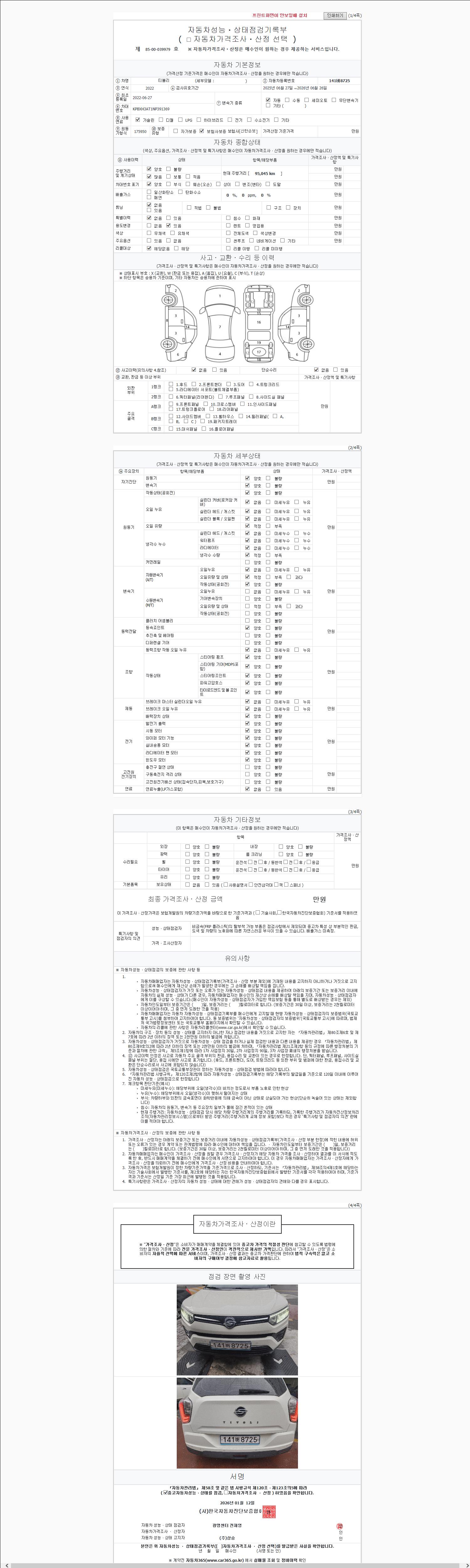 | 주행거리 | 95,045 km | 차량번호 | 141버8725 |