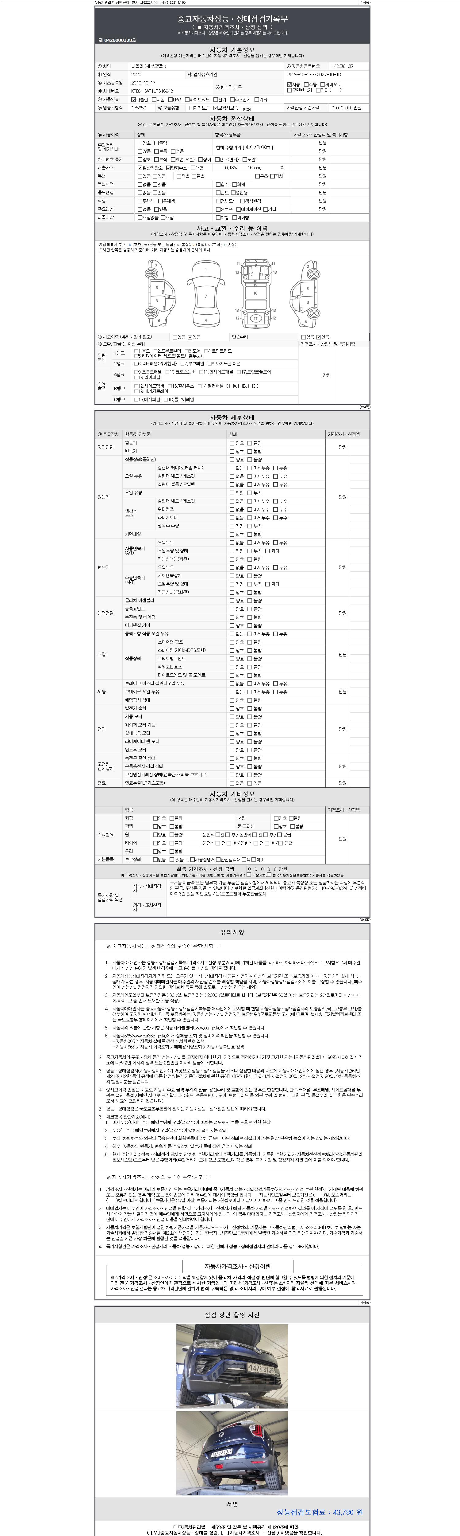 | 주행거리 | 47,737 km | 차량번호 | 142고8135 | 사고유무 | 성능기록부 참조 | 제시번호 | 제 2147483647 호 |